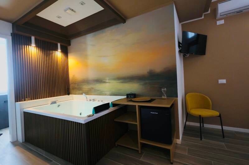La nostra Camera Deluxe dispone di un design ricercato e comfort esclusivi, tra cui vasca idromassaggio privata 🛁, letto king size, bagno elegante, aria condizionata, TV a schermo piatto, Wi-Fi, frigobar, set cortesia, asciugacapelli e biancheria di qualità.✨